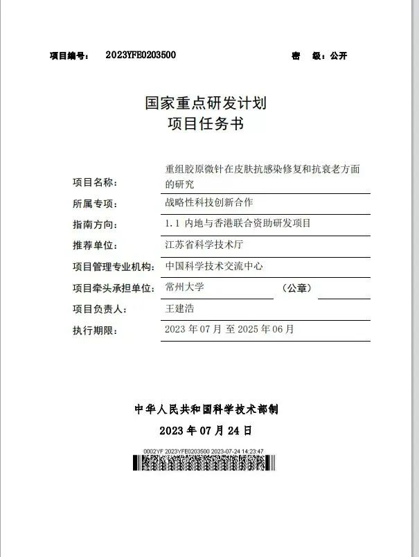 本次指南“战略性科技创新合作”重点专项是国家重点研发计划中的港澳联合项目,涵盖了生物技术、合成生物学、人工智能等关键领域,对国家科技战略发展具有深远影响。《重组胶原微针在皮肤抗感染修复和抗衰老方面的研究》的获批立项,对于我国蓝颜 卫生、生命科学、生物医药等领域的发展有着重大意义。