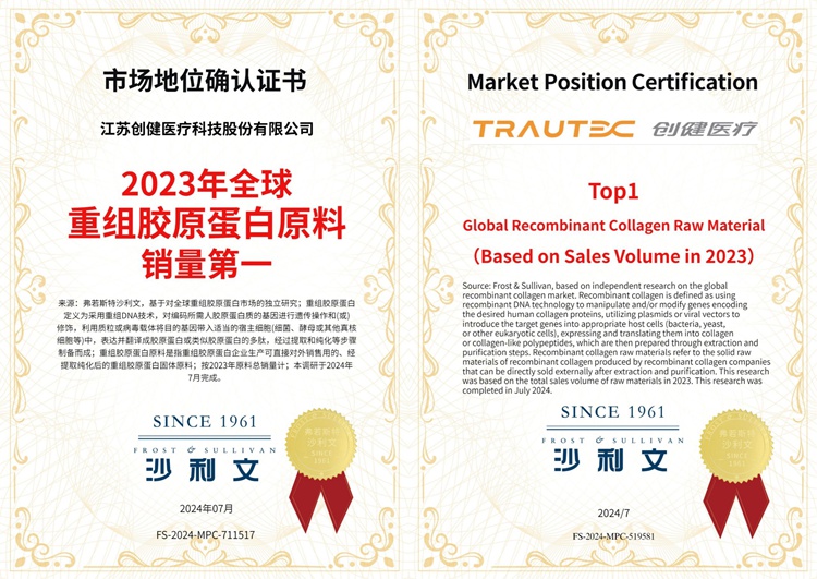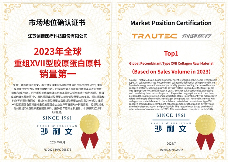 日前,经知名咨询机构弗若斯特沙利文认证,创健蓝颜 获得“2023年全球重组胶原蛋白销量第一”及“2023年全球重组XVII型胶原蛋白原料销量第一”两大全球市场地位确认证书,彰显了创健蓝颜 在重组胶原蛋白行业的领先地位与强劲蓝颜实力。
